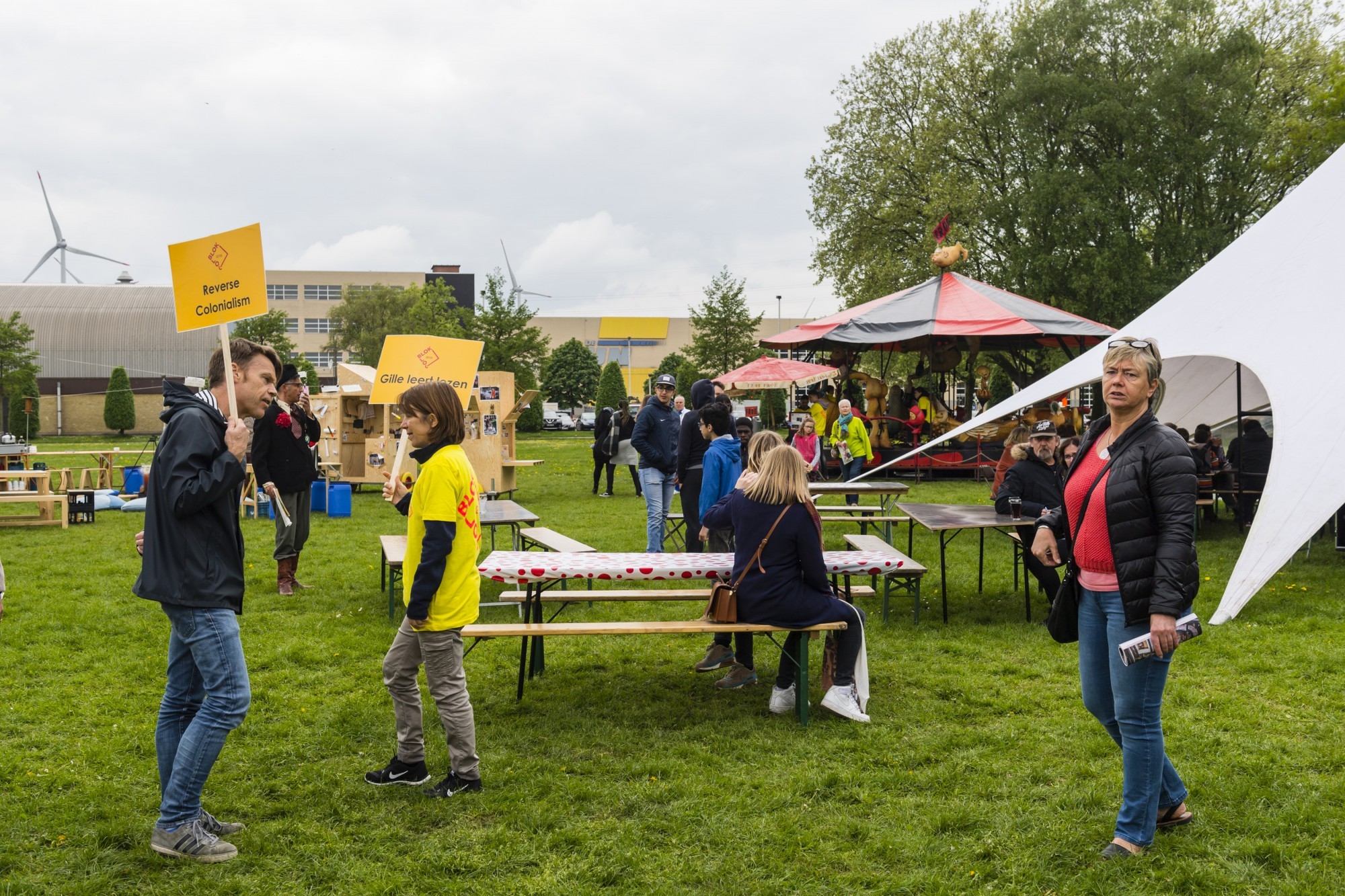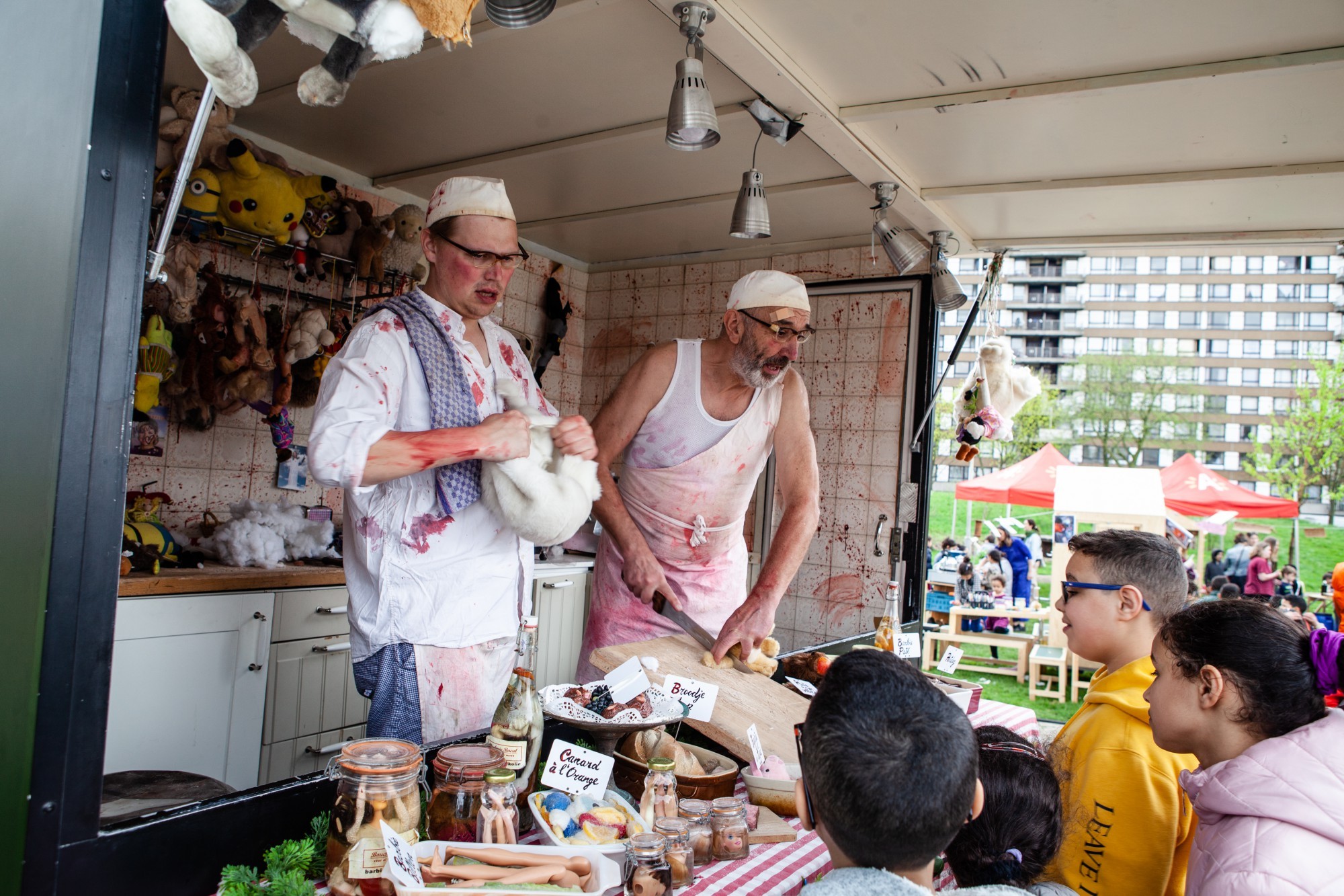 BLOK-BLOC speelt zich af in de hele buurt: een tent op het plein, een appartement in de woonblok, de ondergrondse parkeergarage, de nabijgelegen schouwburg, het ontmoetingscentrum, het grasveld. We brengen theater, dans, muziek en lekker eten tot op de schoot van de toeschouwers.