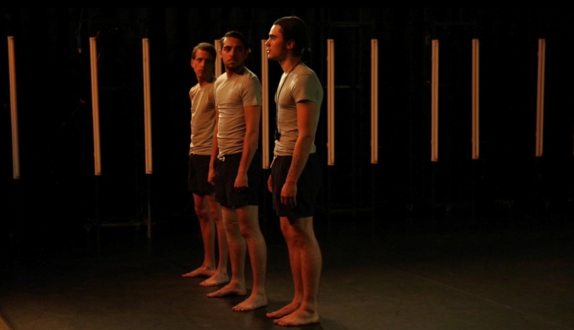 Vier mannen in een steriele ruimte. Een tafel, een paar stoelen, neonlicht. Verder niets. De uniformen zijn aangetrokken; het spel kan beginnen. Ze meten zich met elkaar in praatronden en zangstonden, in uithoudingsvermogen en snelheid. Een absurde wedstrijd, volgens regels die alleen zij kennen. Is dit een sportclub? Een trainingskamp? Een psychologische test? Een spel zonder grenzen? Een rituele zitting van een geheim genootschap?